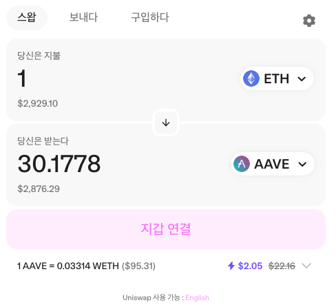 아래와 같이 사용자가 1개의 ETH를 지불하면 30개 정도의 AAVE를 받을 수 있다고 되어있는데